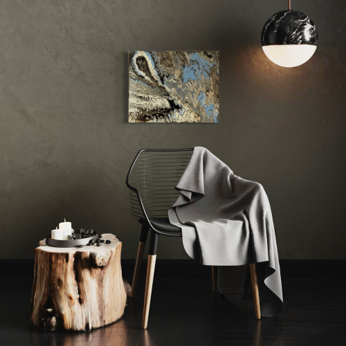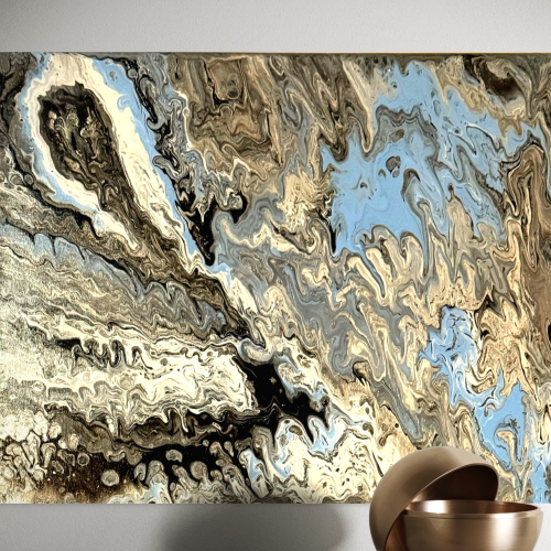 Pour painting on canvas. Metallic silver, black, white and light blue converge to beautiful fluid magic on canvas.