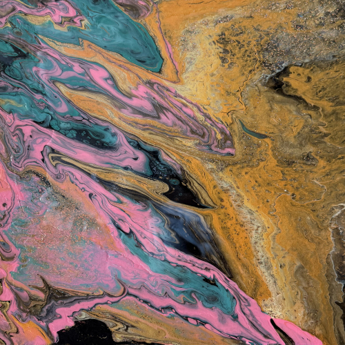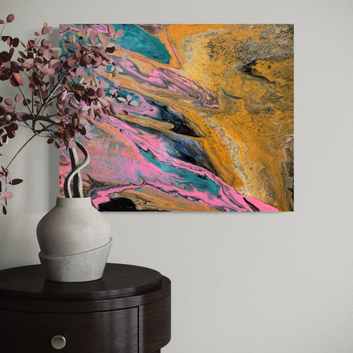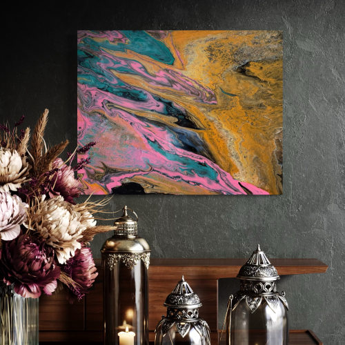 This abstract piece swirls vibrant hues of pink, teal and ochre, embodying movement and flow.