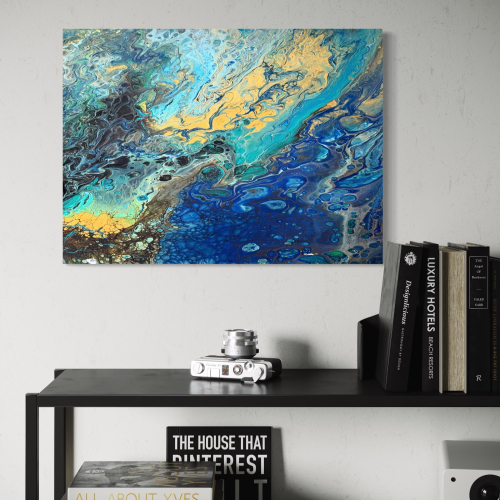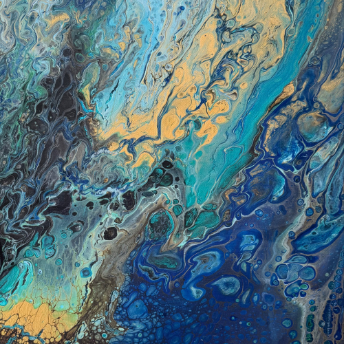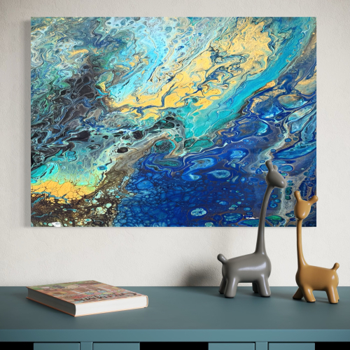 A swirling blend of blues and yellows captures the essence of fluidity and movement in this abstract acrylic pour.